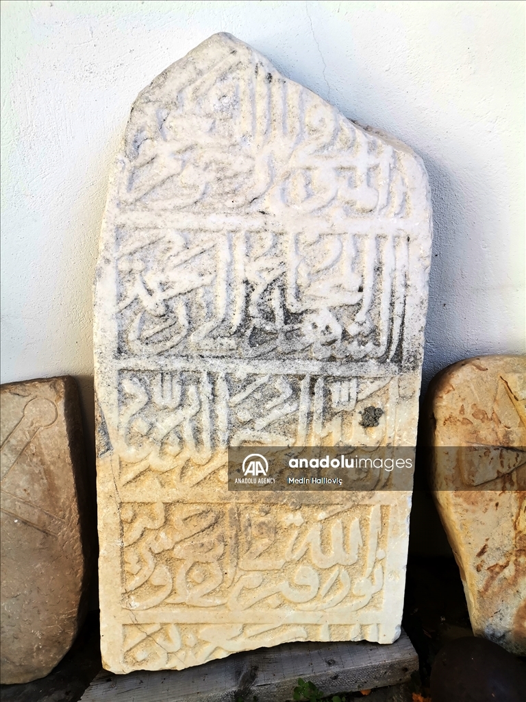 Novi Pazar, Srbija: 20. novembar 2021: U toku novih arheoloških iskopavanja Bedema, Sjeverne tabije Novopazarske tvrđave, arheolozi su otkrili nove objekte i pokretni arheološki materijal koji će, ističu, pomjeriti jedan historijski kontekst i dopuniti prošlost ovog grada i regije. Pored osnove svih objekata na tom koji arheolozi vezuju za 16. vijek pronađen je bijeli nišan sa ispisanim tekstom i mezar (grob) šehida (poginulog vojnika) iz 1514. godine. ( Medin Haliloviç - Anadolu Agency )Medin Haliloviç