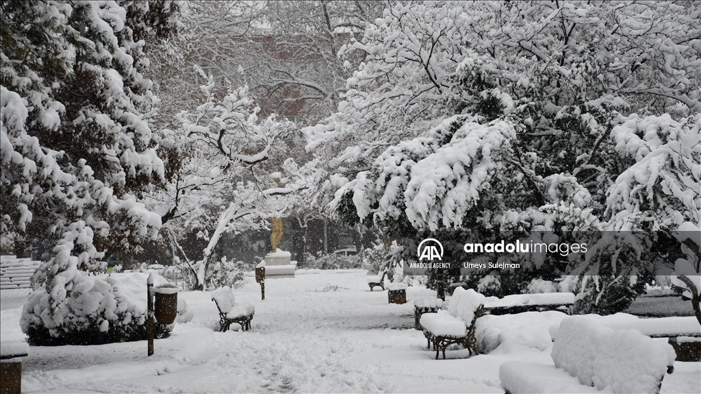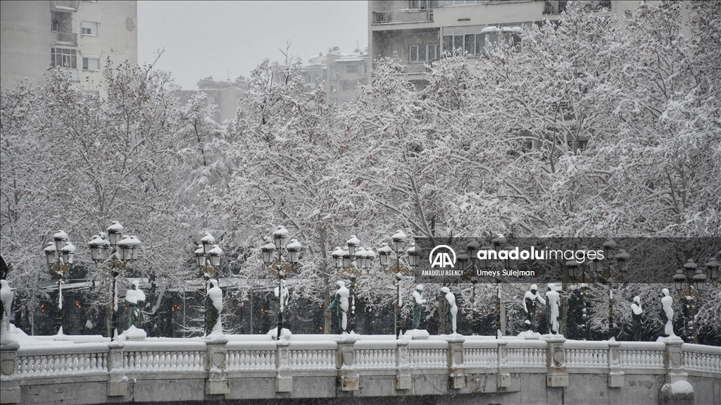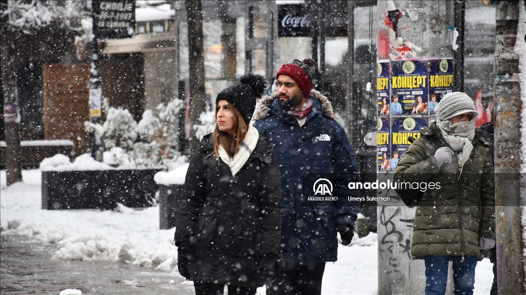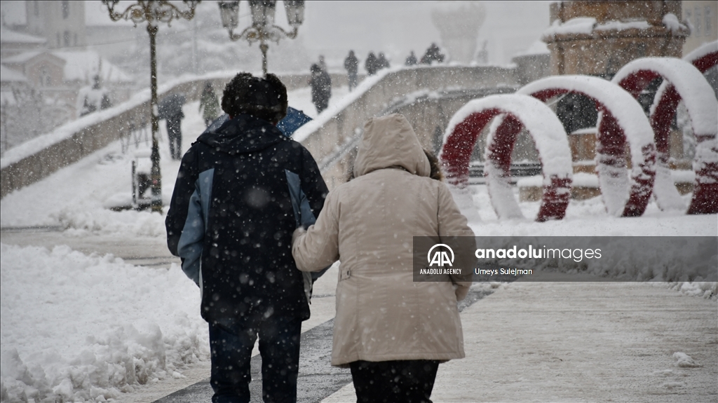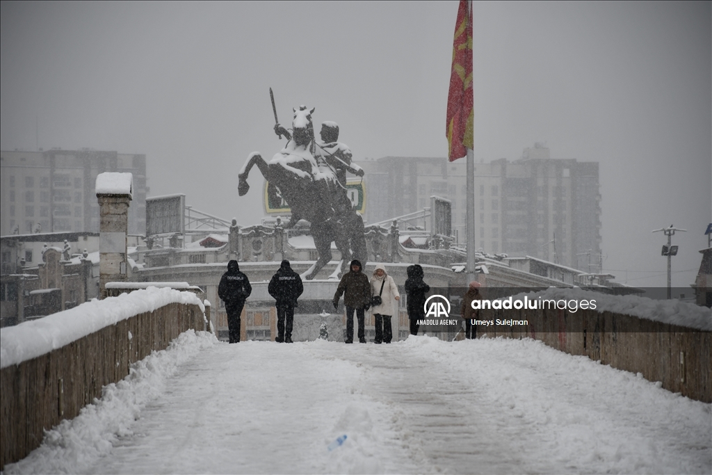 Ulice glavnog grada Sjeverne Makedonije Skoplja u nedjelju je prekrio snijeg, a padavine su zahvatile i šire područje zemlje, prenosi Anadolu. (Umeys Sulejman - Anadolu Agency )Umeys Sulejman