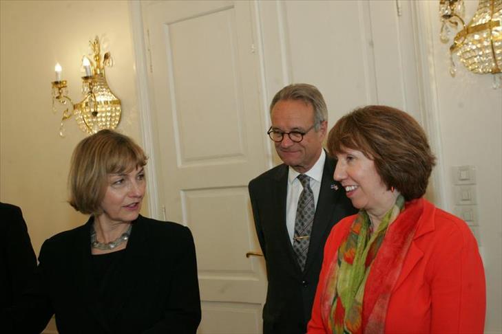 Visoka predstavnica Europske unije za vanjske poslove i sigurnosnu politiku i potpredsjednica Europske komisije Catherin Ashton sastala se u Banskim dvorima.s potpredsjednicom Vlade i ministricom vanjskih i europskih poslova Hrvatske Vesnom Pusić.