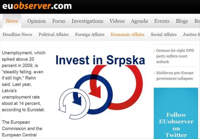 Tako su na portalu euobserver.com, jednom od najpoznatijih internet portala koji prati rad institucija Evropske unije (EU) vlasti RS-a zakupile oglasni prostor, te pozivaju posjetitelje da ''investiraju u Srpsku''.