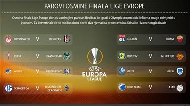 NYON (AA) - U polufinalu Evropa lige igrat će Ajax-Lyon i Celta-Manchester United, odlučeno je današnjim žrijebom u sjedištu Evropske fudbalske asocijacije (UEFA), javlja Anadolu Agency (AA).