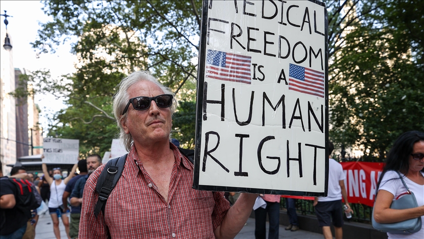 Stotine stanovnika New Yorka okupilo se u srijedu ispred zgrade gradske Vijećnice kako bi protestovali protiv obavezne vakcinacije protiv koronavirusa koja bi im omogućila učešće u mnogim aktivnostima, prenosi Anadolu Agency (AA).
