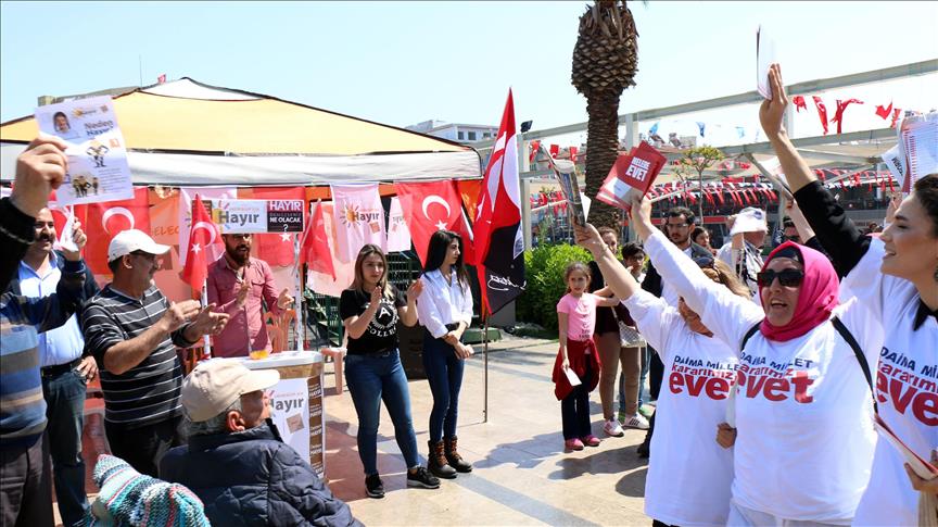 Na gradskom Trgu Ataturk u Aydinu oponentske političke opcije vladajuće Stranke pravde i razvoja (AK Parti) i opozicione Republikanske narodne partije (CHP) jedni pored drugih su podigli štandove i provode aktivnosti kampanje kako bi birače uvjerili u važnost izlaska na referendum i glasanja za ili protiv reformi.