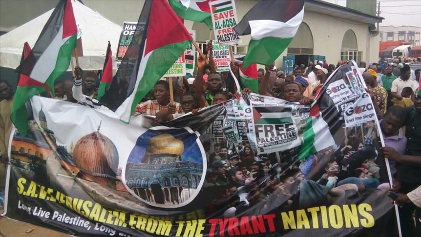 Displaying placards condemning the development, the protesters also called on the Nigerian leader Muhammadu Buhari to break his silence over the 'glaring injustice' done to the Palestinians and the Muslim world.