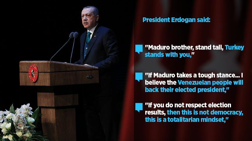 Erdogan said: “Maduro brother, stand tall, Turkey stands with you, Erdogan tells President Nicolas Maduro by telephone,” according to Turkish presidential spokesman Ibrahim Kalin's on Twitter.