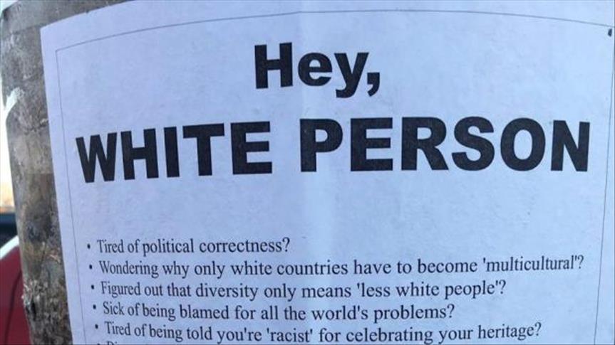 The signs read: “Hey, WHITE PERSON” are you “wondering why only white countries have to become ‘multicultural’? and why “diversity only means less white people?” Global television news reported.