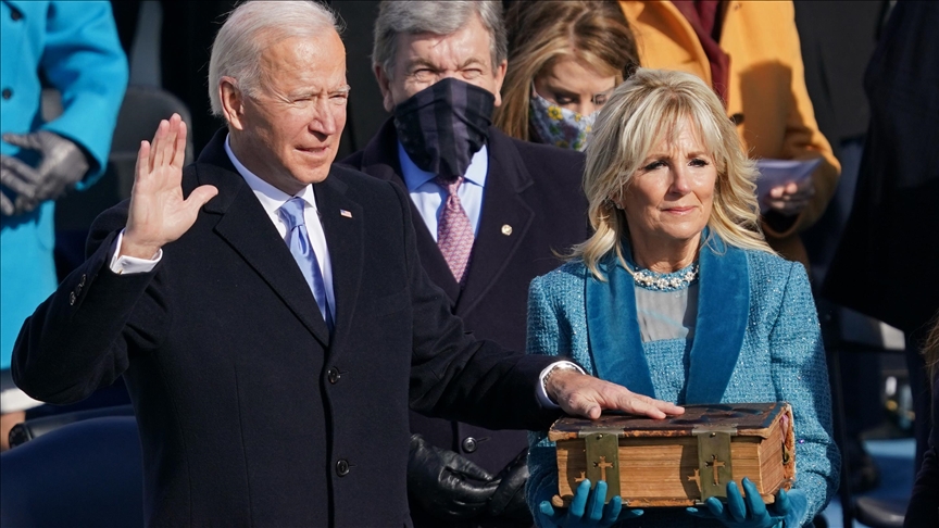 He put his left hand on the five-inch thick bible that featured a Celtic cross on the cover that was held by now-first lady Jill Biden and took the 35-word oath administered by Chief Justice John Roberts.