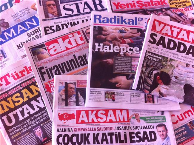 All the Turkish dailies covered on Thursday the chemical attack that hit Syria which killed over 1,000 people and left many others wounded near the capital Damascus. "Shame on you humanity" is what daily TURKIYE headlined referring to the chemical attack. There are around 2,000 deaths, most of whom were children, said the daily, showing a large picture of dead children lying on the ground. "These children are not sleeping," the daily said, stressing that most of the children died because of the sarin gas used in the attack. Daily AKIT published "Pharaohs compete," saying that- with his latest chemical attack on the Syrian people- Assad was competing with Abdel Fattah al-Sisi of Egypt. The daily gave the number of the deaths in the chemical attack as 1,500 and the number of those wounded as over 3,000. Daily CUMHURIYET titled "Images of violence in Syria" and said the "massacre" was brought into the agenda of the UN Security Council. Turkey called on the international community to take action, the daily said. Daily RADIKAL headlined "Like Halabja," implying that Syria's alleged chemical attack in 2013 was reminiscent of the Halabja massacre in 1988. Around 5,000 people were killed in the Halabja massacre ordered by Saddam Hussein, the daily said. Daily RADIKAL called on the UN to take action on Syria's chemical attack by asking "When, if not now?" Another daily, which made a connection between Saddam Hussein's Halabja massacre and Syria's chemical attack on Tuesday, August 20th, 2013 was daily VATAN. "Like Saddam" the daily published, saying that hundreds of civilians mostly consisting of children had passed away in their sleep in six cities near the capital Damascus. The US demands that the UN access the alleged Syria chemical-attack site while Russia sees the attack as a planned provocation, the daily published. "25 years after the Halabja massacre, this time Assad used chemical weapons against civilians," daily ZAMAN said while also including the Assad regime's denial of the attack. Daily STAR published "This is Assad's Halabja" in reference to Iraq's Halabja massacre in 1988. The target of the attack was the families of the opposition, claimed the daily, noting that the attack was carried out in Damascus suburbs where the families of the opposition groups lived. A doctor working in the region said that all the symptoms of sarin gas were found on the dead bodies, the daily published. Daily STAR also covered Turkey's strong condemnation of the attack while finding the UN's "We are concerned" statement insufficient. The daily cited Turkish Foreign Minister Ahmet Davutoglu on the recent attack in Syria as saying, "If the international community had listened to us, today there would not have been so many deaths of innocent people." Daily AKSAM headlined "Assad, the baby killer," saying that he has committed a crime against humanity by attacking his own people using chemical weapons. The daily pointed out that the reports of the attack came as a UN team of chemical weapons experts was visiting Damascus. "The time when the earth stops," published daily YENI SAFAK while stressing that the Syrian regime's chemical weapons attack in Damascus during mid-night killed 1,300 civilians.