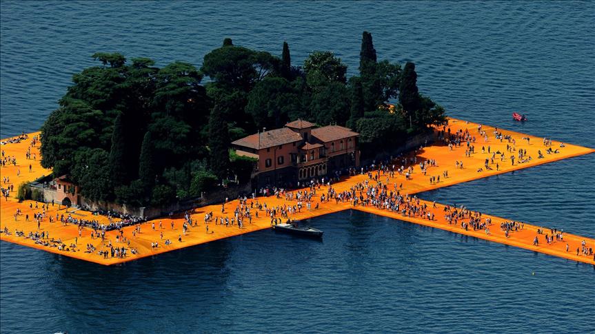 Some 200,000 floating cubes were placed on the lake to make the runway connecting the village of Sulzano in the northern Lombardy region to the small island of Monte Isola for a 16-day outdoor installation which opened this weekend.