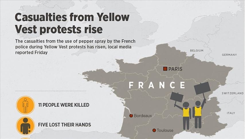 The casualties from the use of pepper spray by the French police during Yellow Vest protests has risen, local media reported Friday.