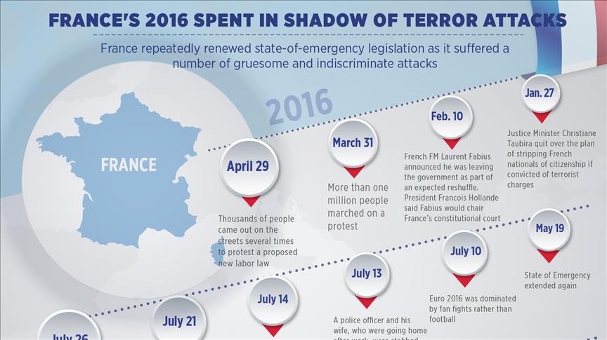 2016 in France passed in the shadow of terrorist attacks and amid a state of emergency declared after the November 2015 Paris attacks which killed 130 people.