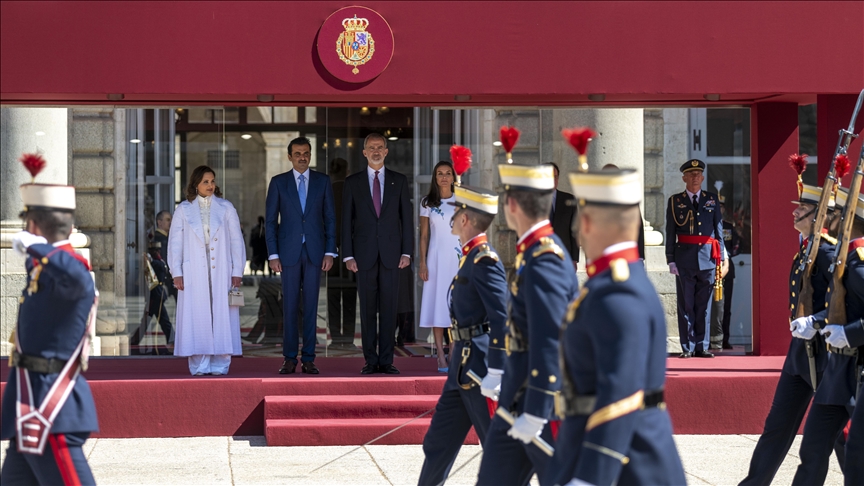 The Qatari royals were welcomed by Spain’s king and queen in the royal palace, where both couples will attend a gala for dinner alongside Spanish Prime Minister Pedro Sanchez.