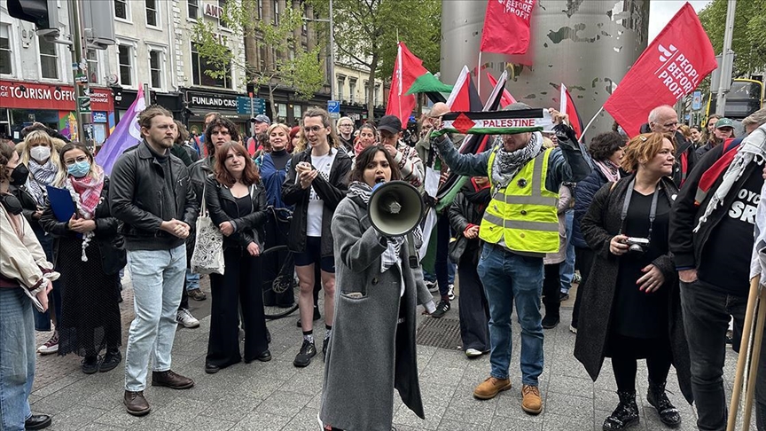 Activists gathered at the city's Light Monument waving Palestinian and Irish flags and then marched to Trinity College.