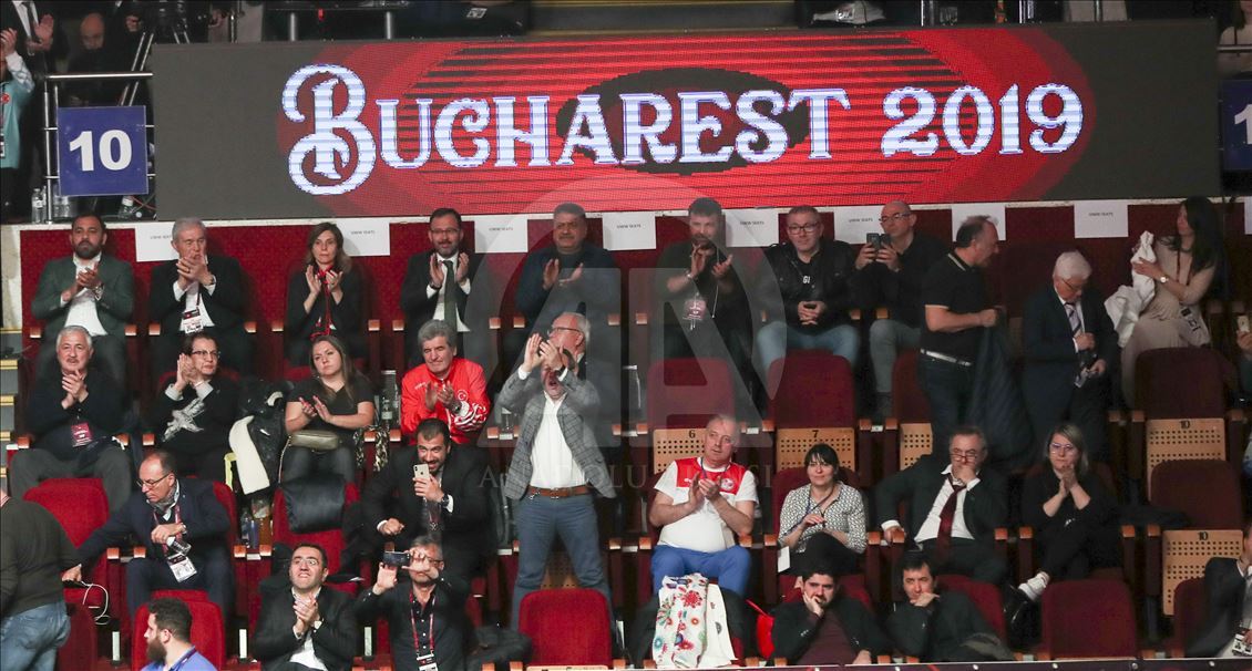BUCHAREST, ROMANIA - APRIL 13: Riza Kayaalp (blue) of Turkey is seen after winning the gold medal following his match against Iakobi Kajaja of Georgia in men's 130kg greco roman category within the 2019 European Wrestling Championships in Bucharest, Romania on April 13, 2019. Kayaalp defeated Iakobi Kajaia with 3-0 score. The victory marked Kayaalp's ninth European title. ( Ahmet İzgi - Anadolu Agency )