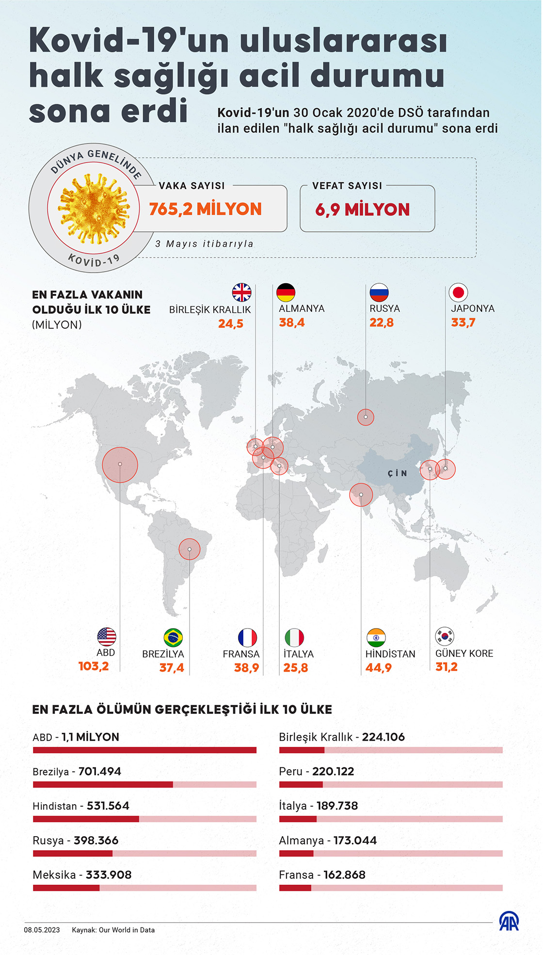 Kovid-19'un 30 Ocak 2020'de DSÖ tarafından ilan edilen "halk sağlığı acil durumu" sona erdi. (Grafik: Efnan İpşir/AA)