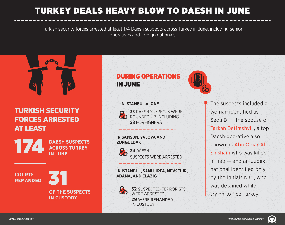Turkish security forces arrested at least 174 Daesh suspects across Turkey in June, including senior operatives and foreign nationals