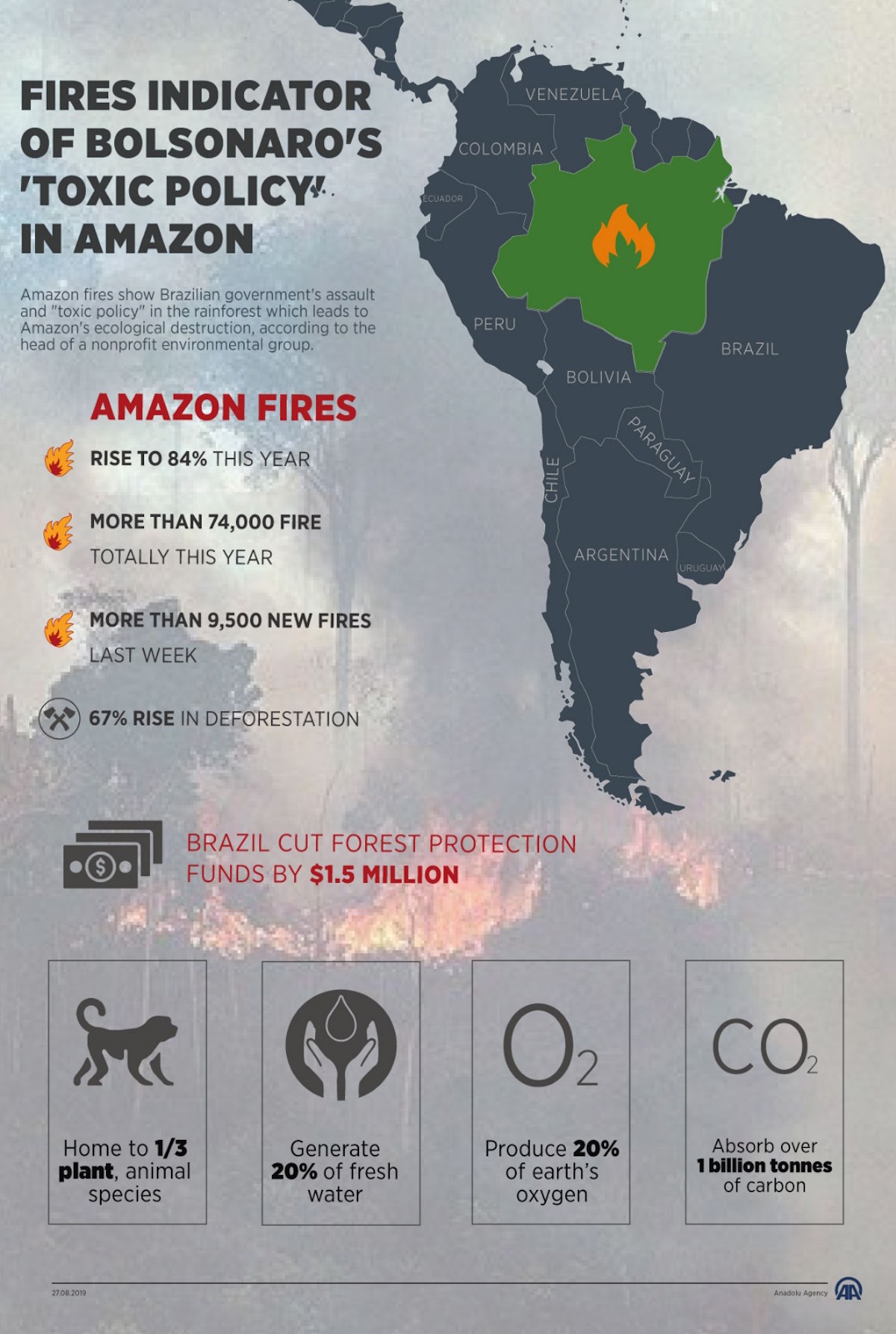 Amazon fires show Brazilian government's assault and "toxic policy" in the rainforest which leads to Amazon's ecological destruction, according to the head of a non-profit environmental group27 August 2019•Update: 27 August 2019