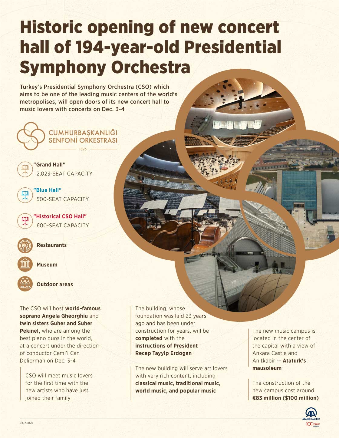 Turkey's Presidential Symphony Orchestra (CSO) which aims to be one of the leading music centers of the world's metropolises, will open doors of its new concert hall to music lovers with concerts on Dec. 3-403 December 2020•Update: 03 December 2020