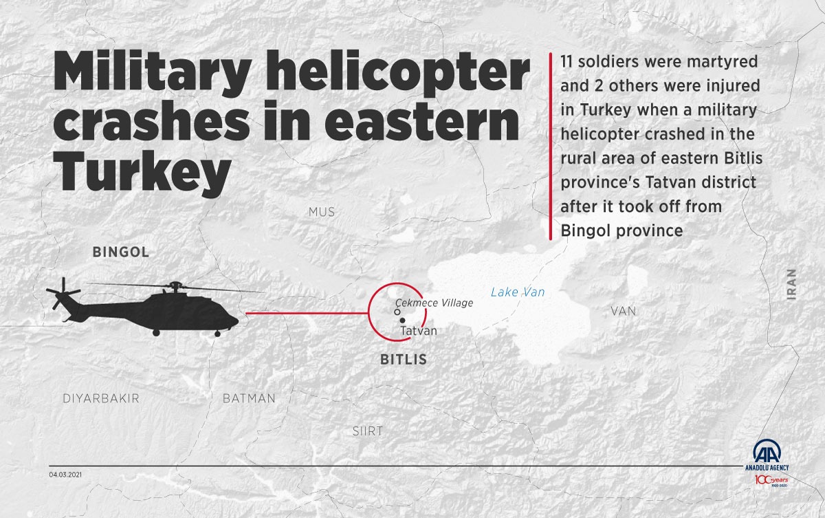 11 soldiers were martyred and 2 others were injured in Turkey when a military helicopter crashed in the rural area of eastern Bitlis province's Tatvan district after it took off from Bingol province