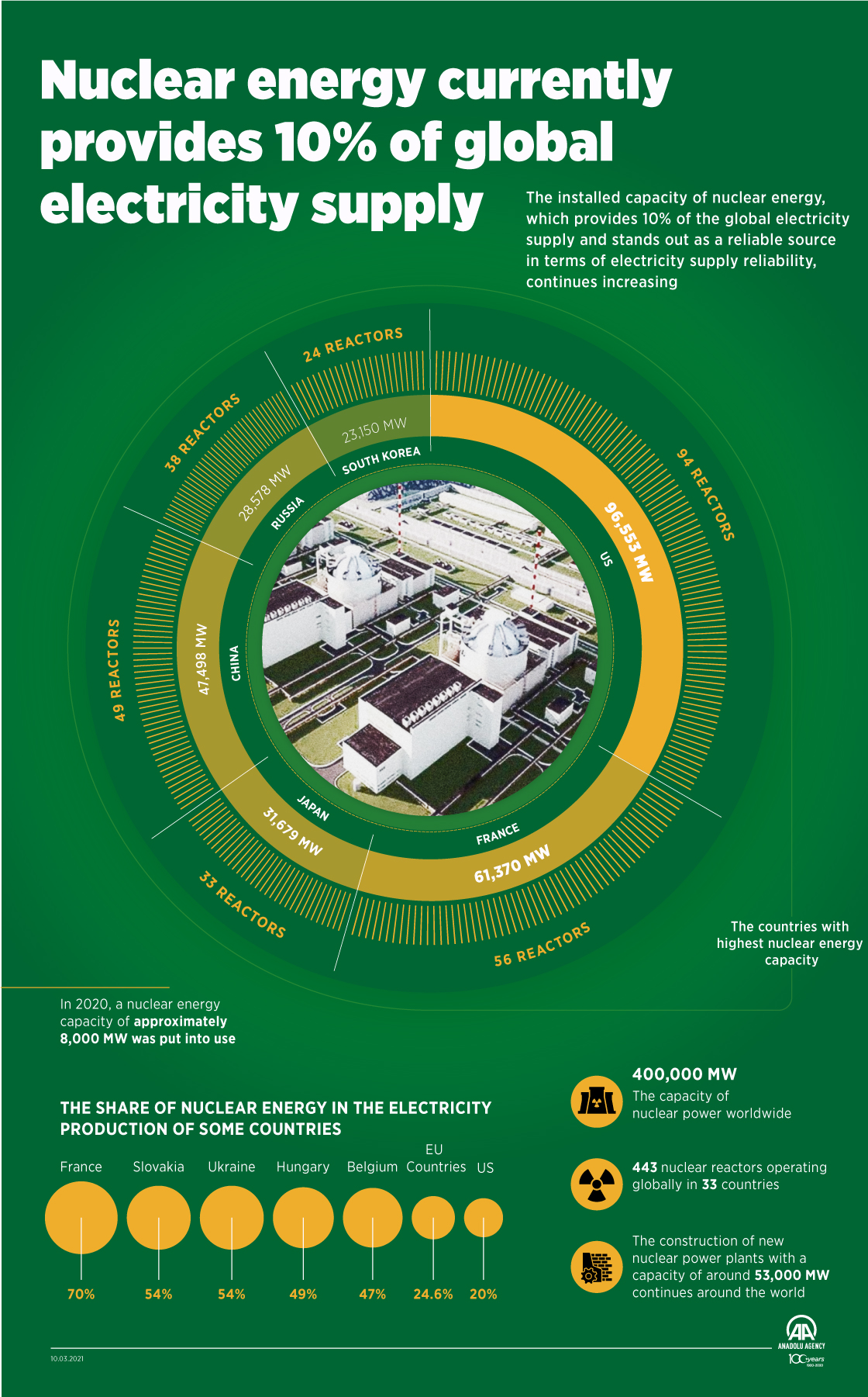 The installed capacity of nuclear energy, which provides 10% of the global electricity supply and stands out as a reliable source in terms of electricity supply reliability, continues increasing10 March 2021•Update: 10 March 2021