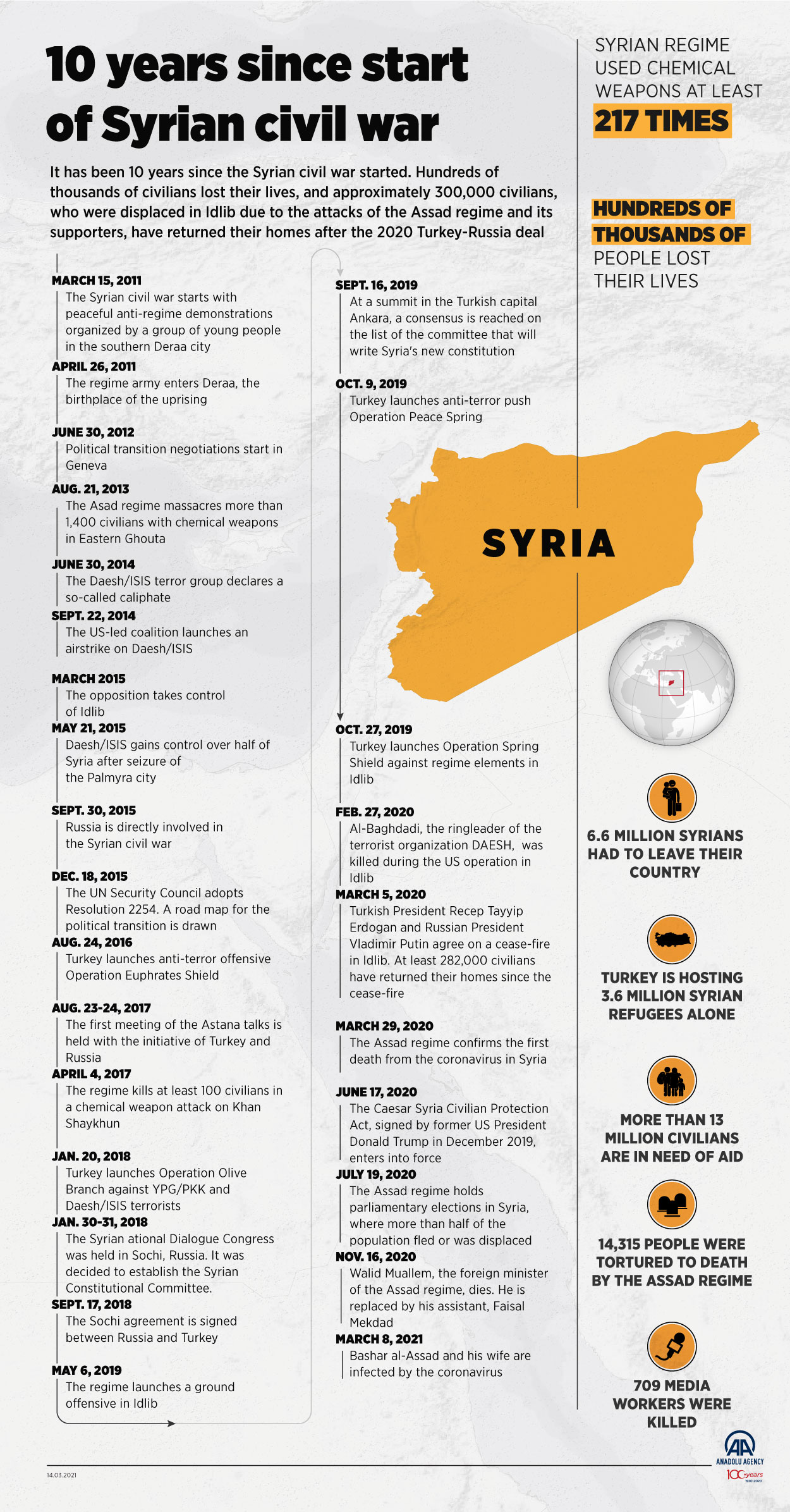 It has been 10 years since the Syrian civil war started. Hundreds of thousands of civilians lost their lives, and approximately 300,000 civilians, who were displaced in Idlib due to the attacks of the Assad regime and its supporters, have returned their homes after the 2020 Turkey-Russia deal14 March 2021•Update: 14 March 2021