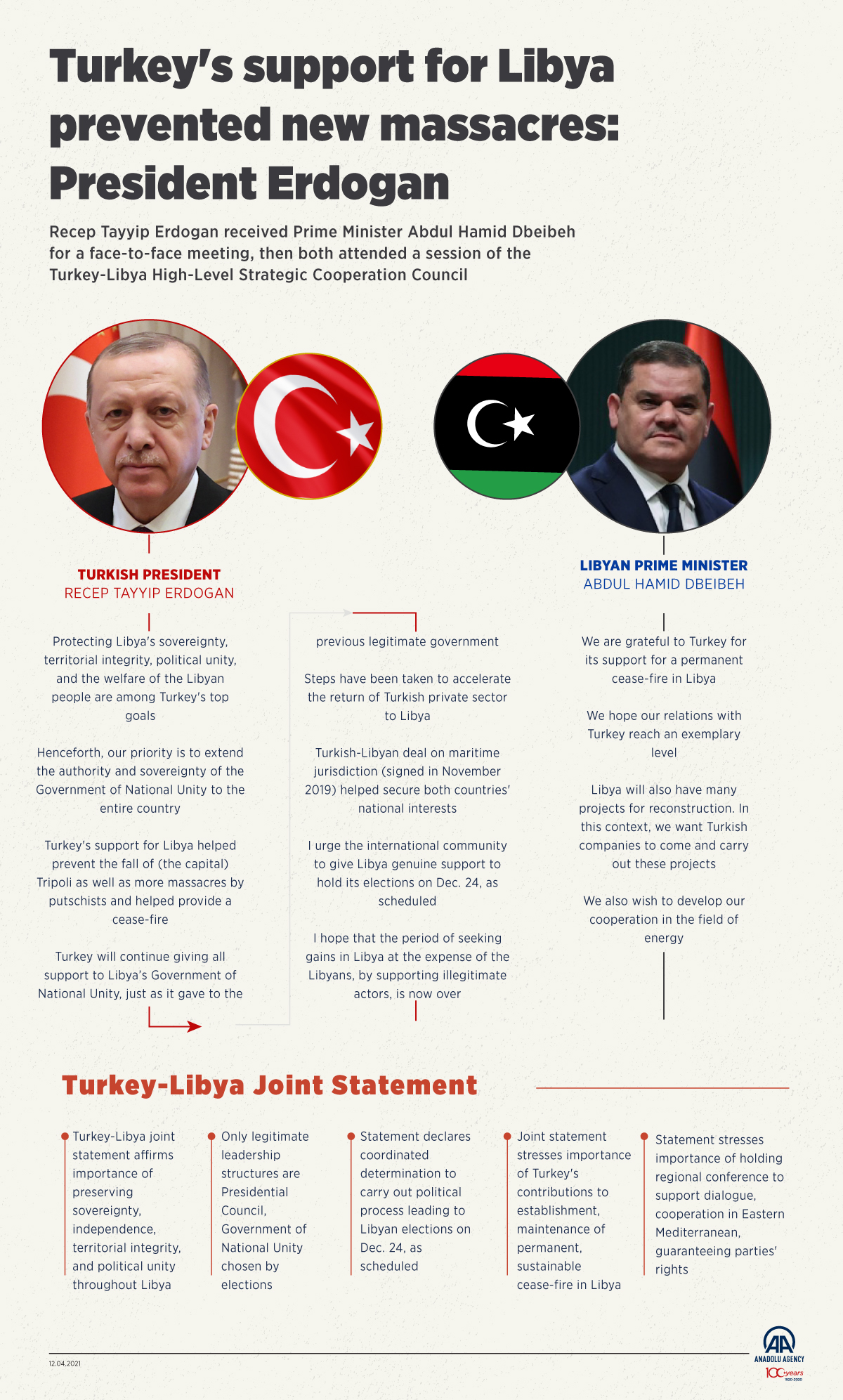 Recep Tayyip Erdogan received Prime Minister Abdul Hamid Dbeibeh for a face-to-face meeting, then both attended a session of the Turkey-Libya High-Level Strategic Cooperation Council13 April 2021•Update: 13 April 2021