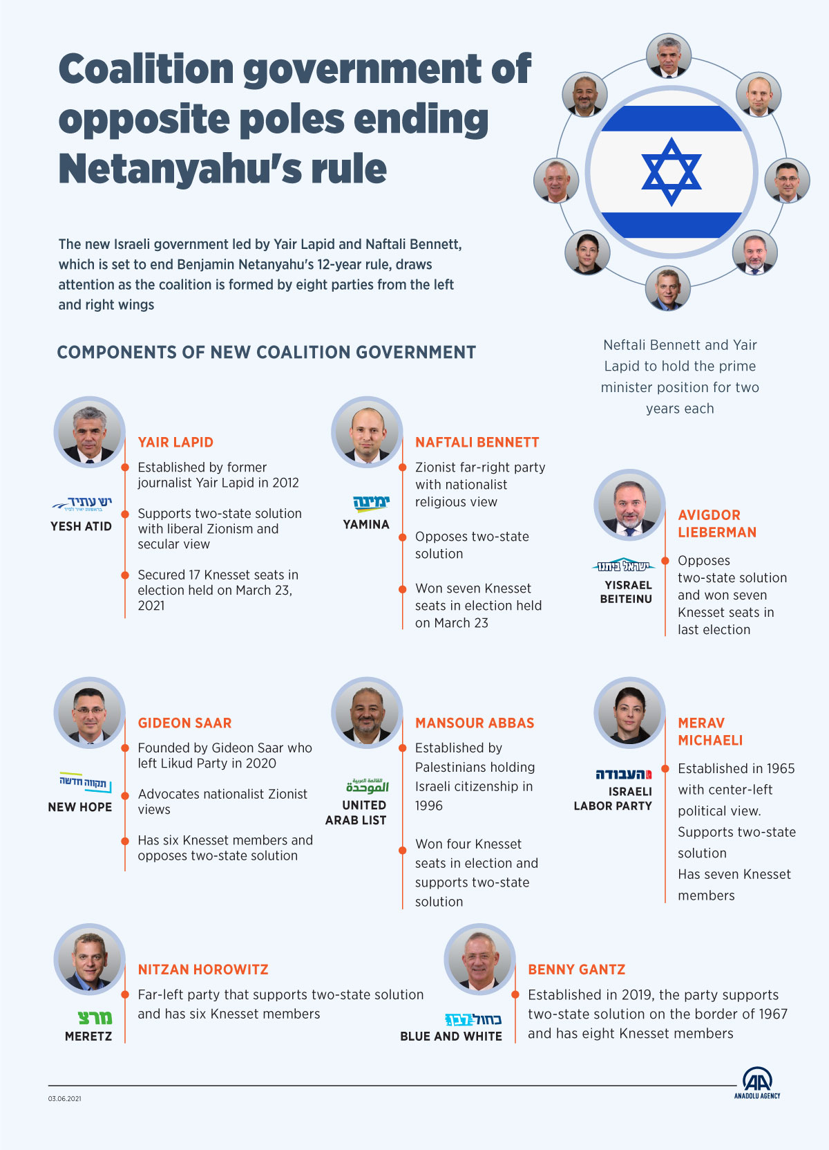 The new Israeli government led by Yair Lapid and Naftali Bennett, which is set to end Benjamin Netanyahu's 12-year rule, draws attention as the coalition is formed by eight parties from the left and right wings03 June 2021•Update: 03 June 2021