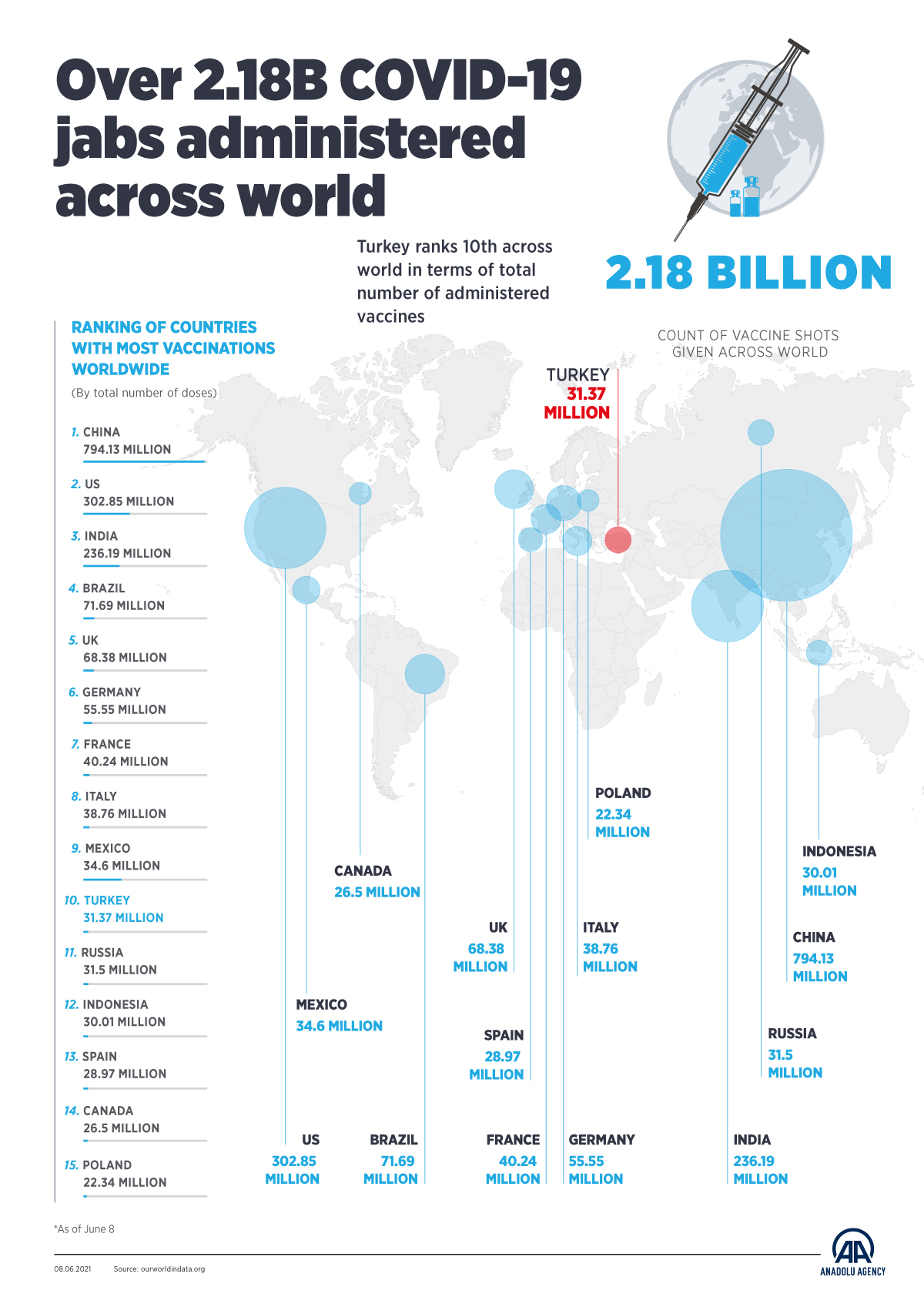 Over 2.18B COVID-19 jabs administered across world
