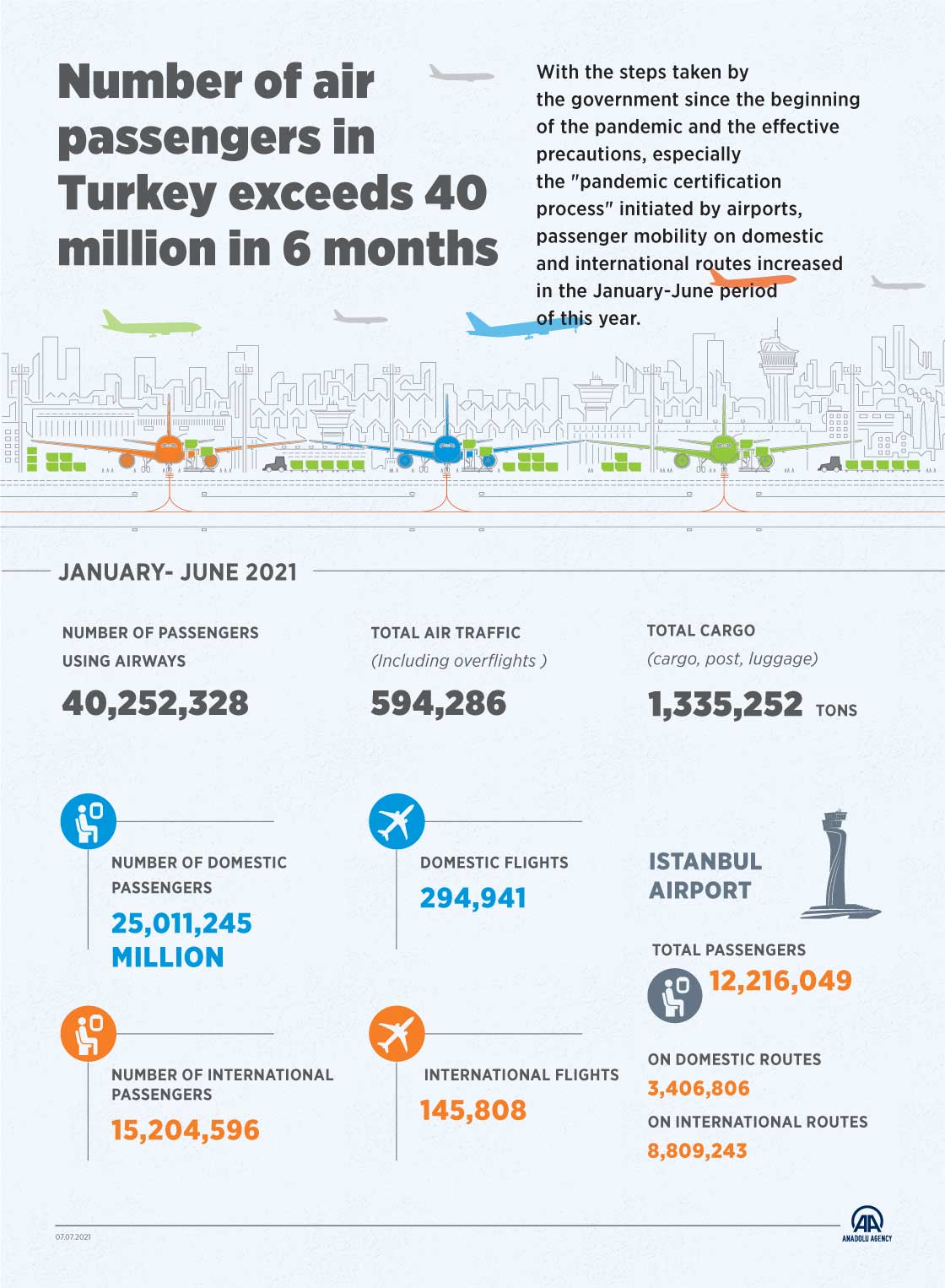 Number of air passengers in Turkey exceeds 40 million in 6 months With the steps taken by the government since the beginning of the pandemic and the effective precautions, especially the "pandemic certification process" initiated by airports07 July 2021•Update: 07 July 2021