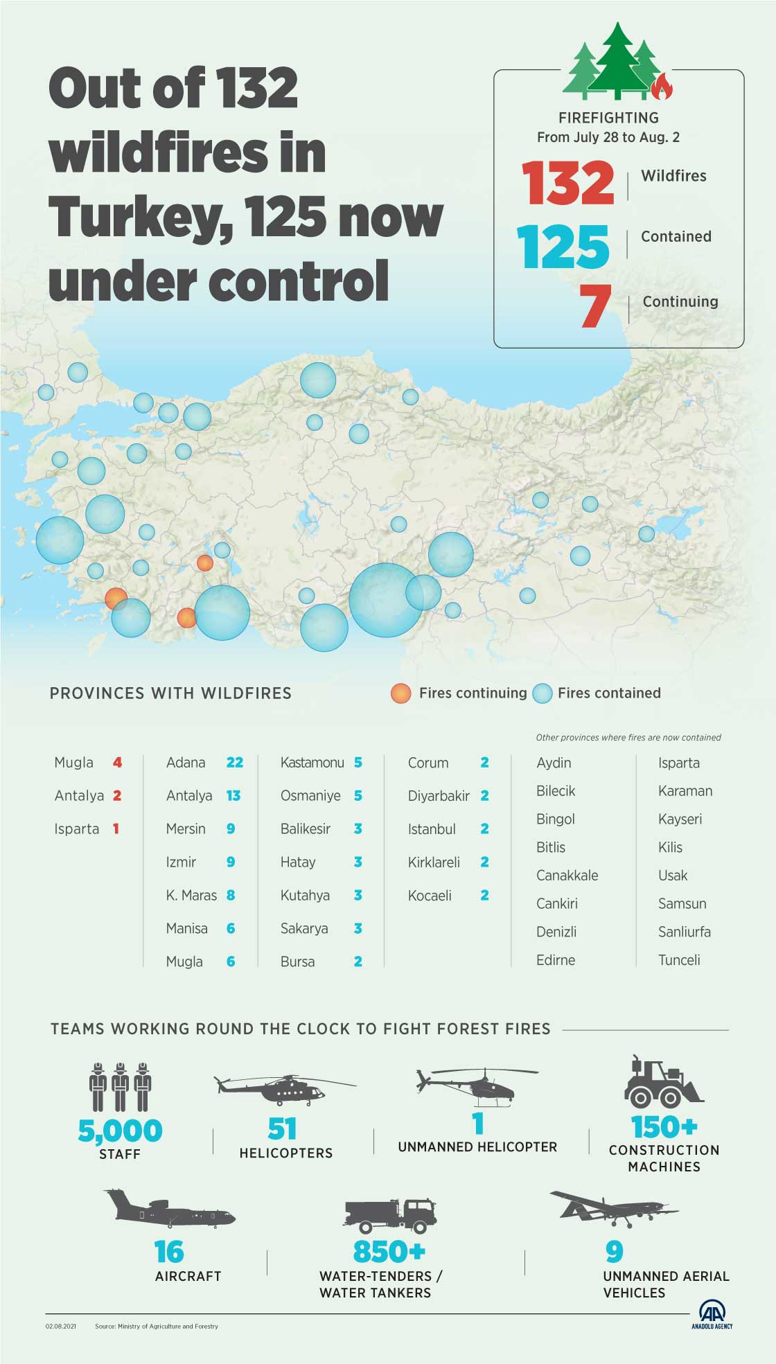 Out of 132 wildfires in Turkey, 125 now under control