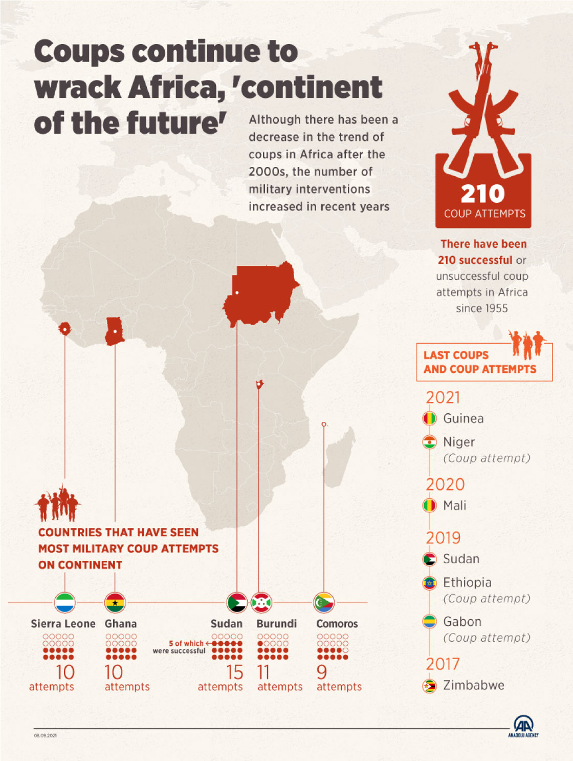 Although there has been a decrease in the trend of coups in Africa after the 2000s, there has been an increase in the number of military interventions in recent years08 September 2021•Update: 08 September 2021