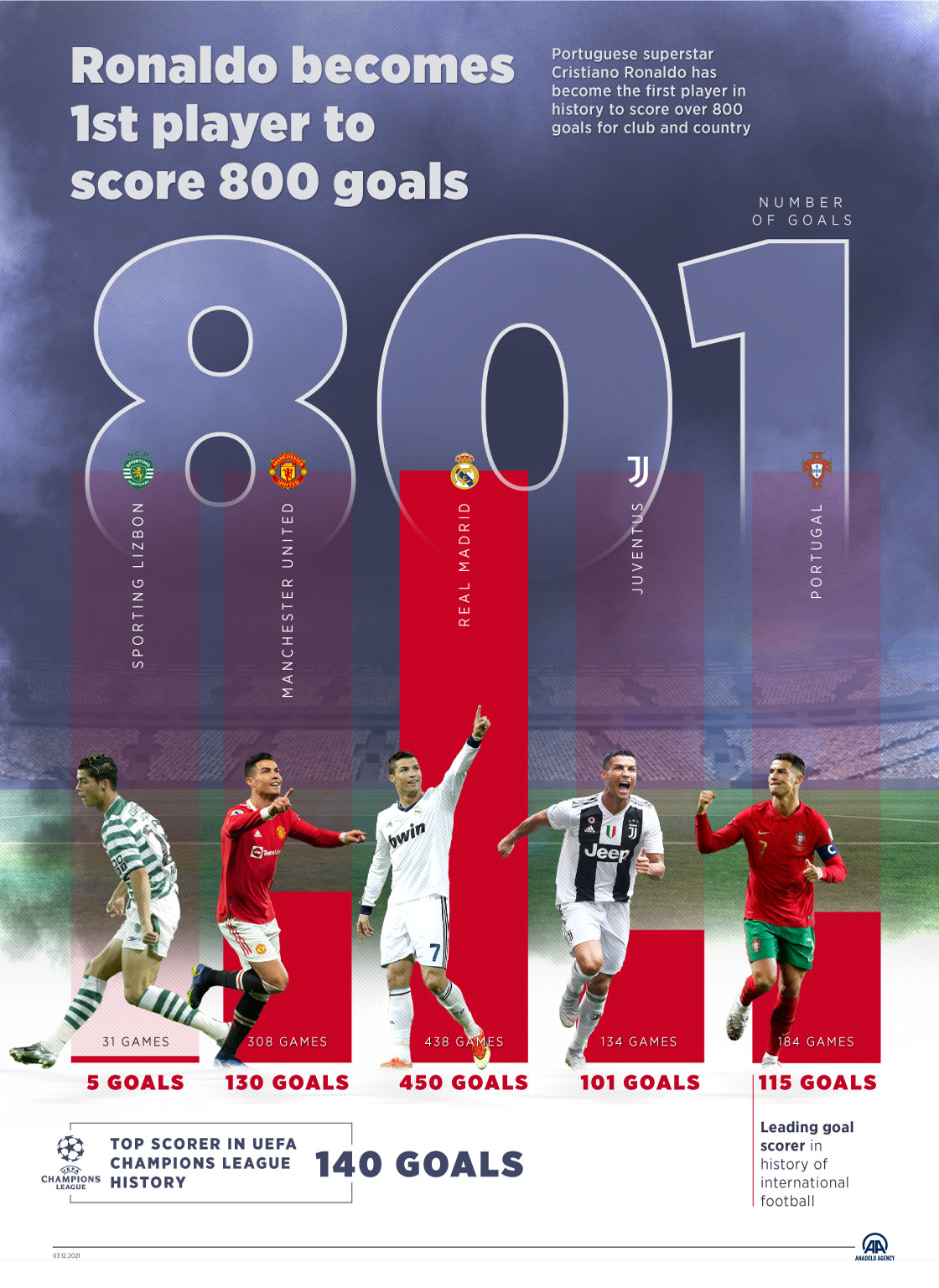 Portuguese superstar Cristiano Ronaldo has become the first player in history to score over 800 goals for club and country