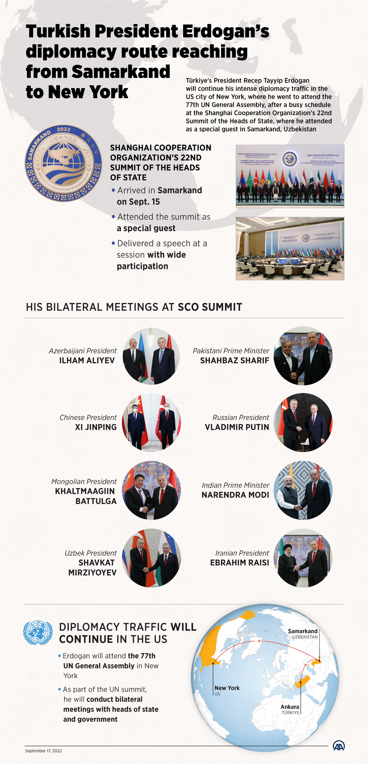 Türkiye's President Recep Tayyip Erdogan will continue his intense diplomacy traffic in the US city of New York, where he went to attend the 77th UN General Assembly, after a busy schedule at the Shanghai Cooperation Organization’s 22nd Summit of the Heads of State, where he attended as a special guest in Samarkand, Uzbekistan17 September 2022•Update: 17 September 2022