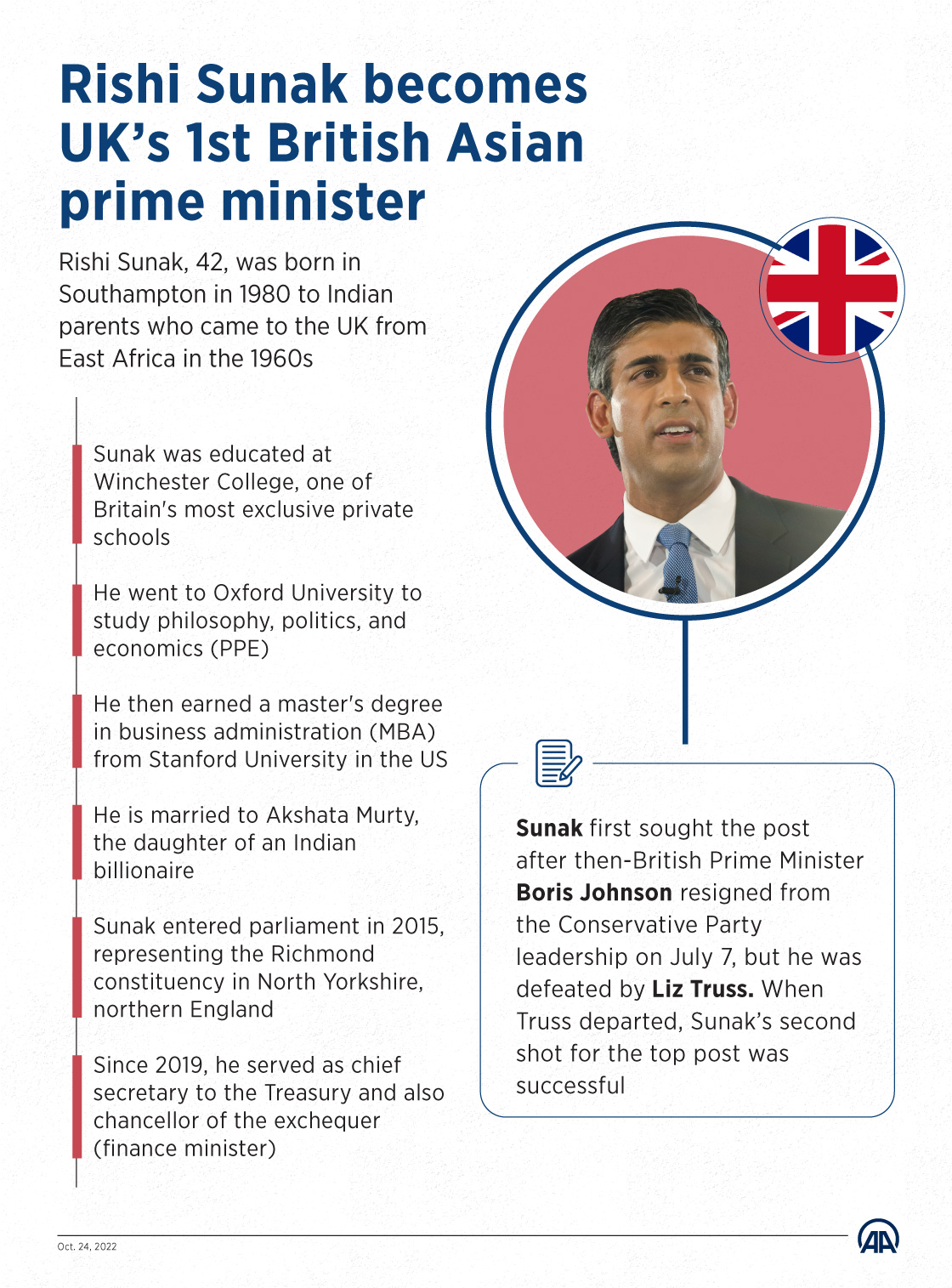 Sunak first sought the post after then-British Prime Minister Boris Johnson resigned the Conservative Party leadership on July 7, but he was defeated by Liz Truss. When Truss departed, his second shot for the top post was successful24 October 2022•Update: 24 October 2022