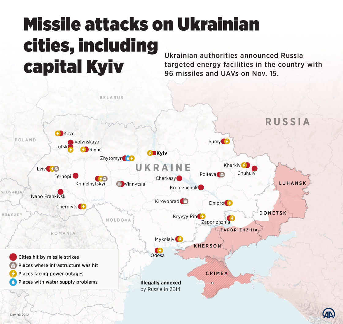 Ukrainian authorities announced that on Nov. 15, Russia targeted energy facilities in the country with 96 missiles and UAVs