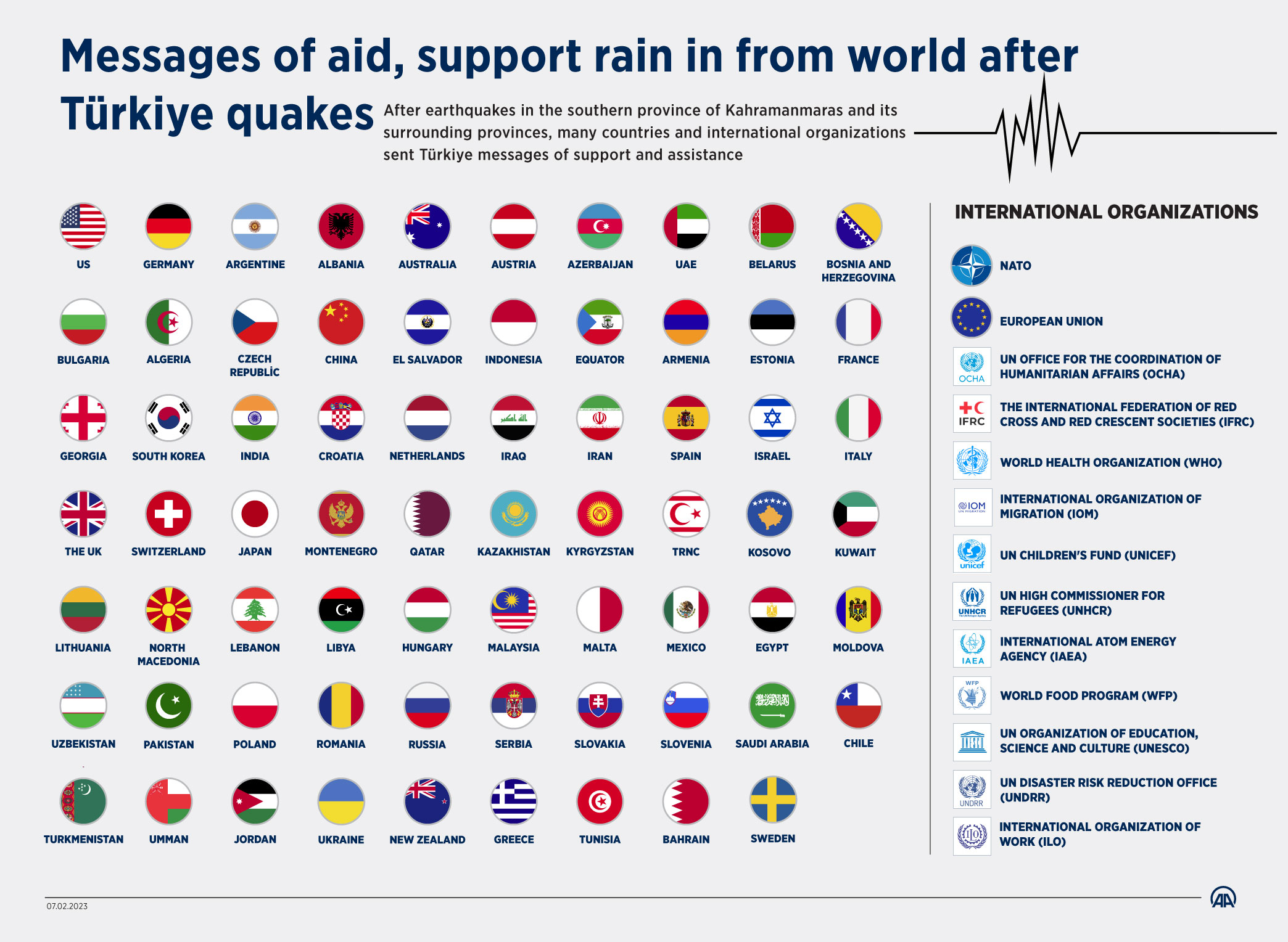 After earthquakes in the southern province of Kahramanmaras and its surrounding provinces, many countries and international organizations sent Türkiye messages of support and assistance07 February 2023•Update: 07 February 2023