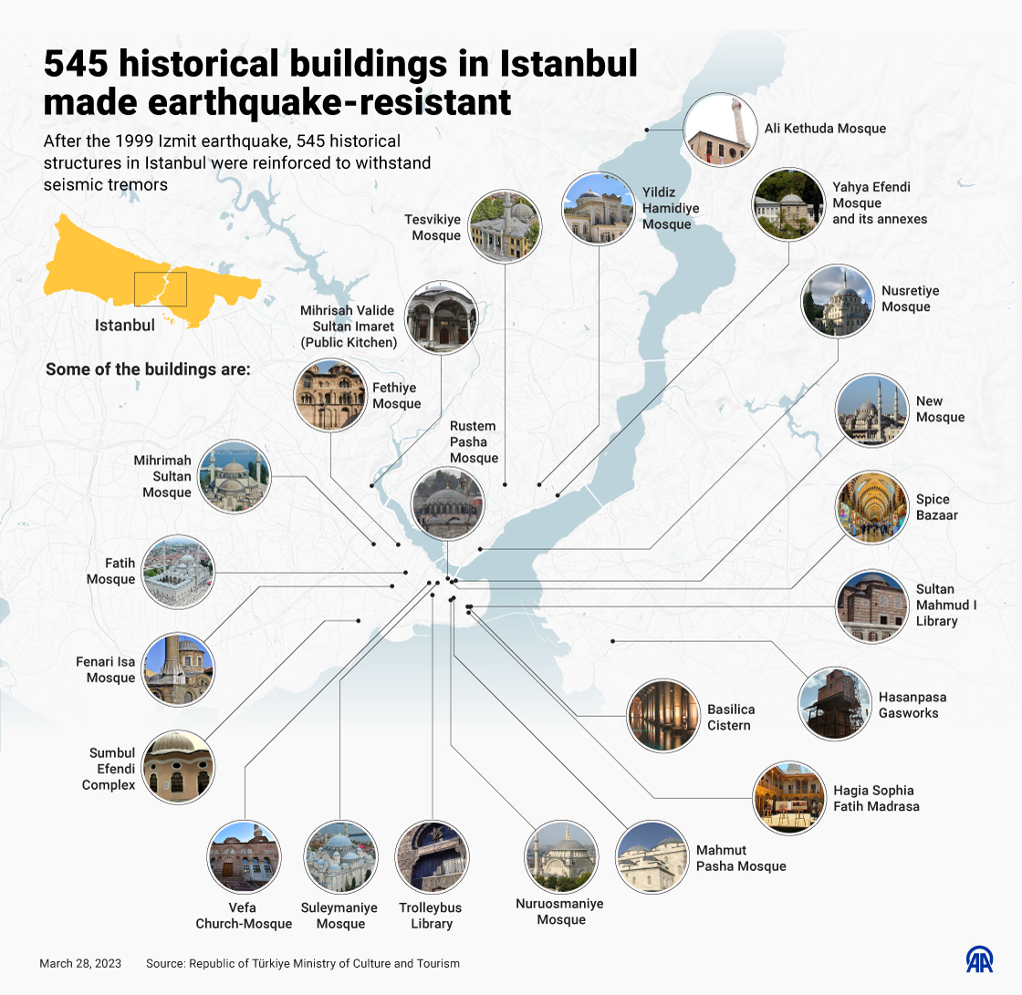 After the 1999 Izmit earthquake, 545 historical structures in Istanbul were reinforced to withstand seismic tremors