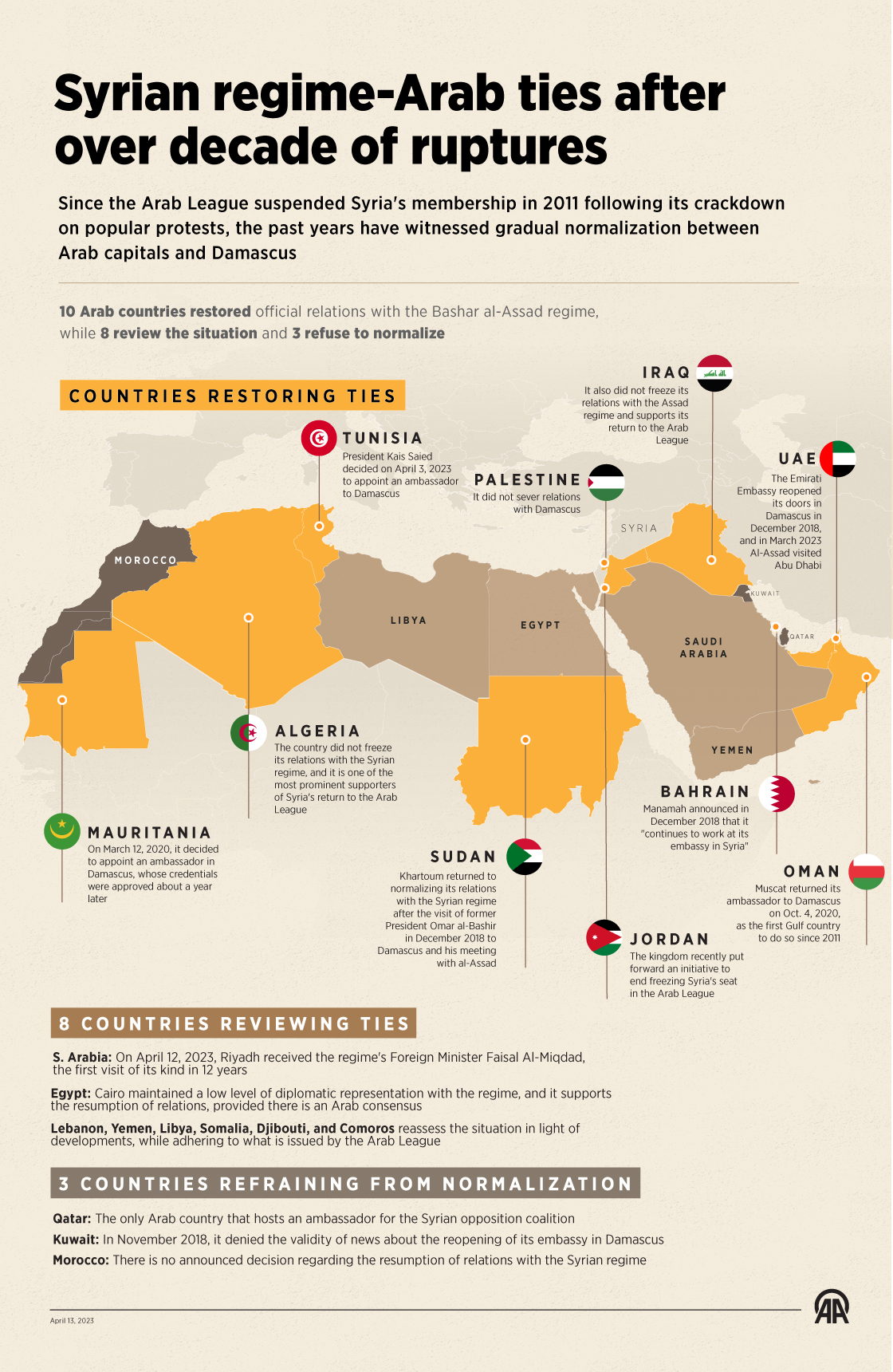 Since the Arab League suspended Syria's membership in 2011 following its crackdown on popular protests, the past years have witnessed gradual normalization between Arab capitals and Damascus.13 April 2023•Update: 13 April 2023