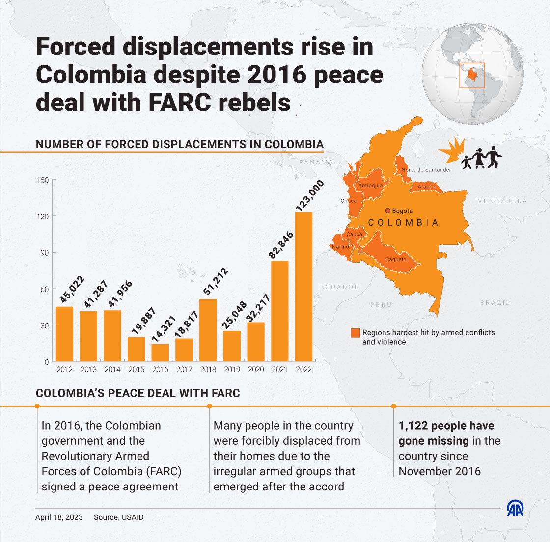Forced displacements rise in Colombia despite 2016 peace deal with FARC rebels