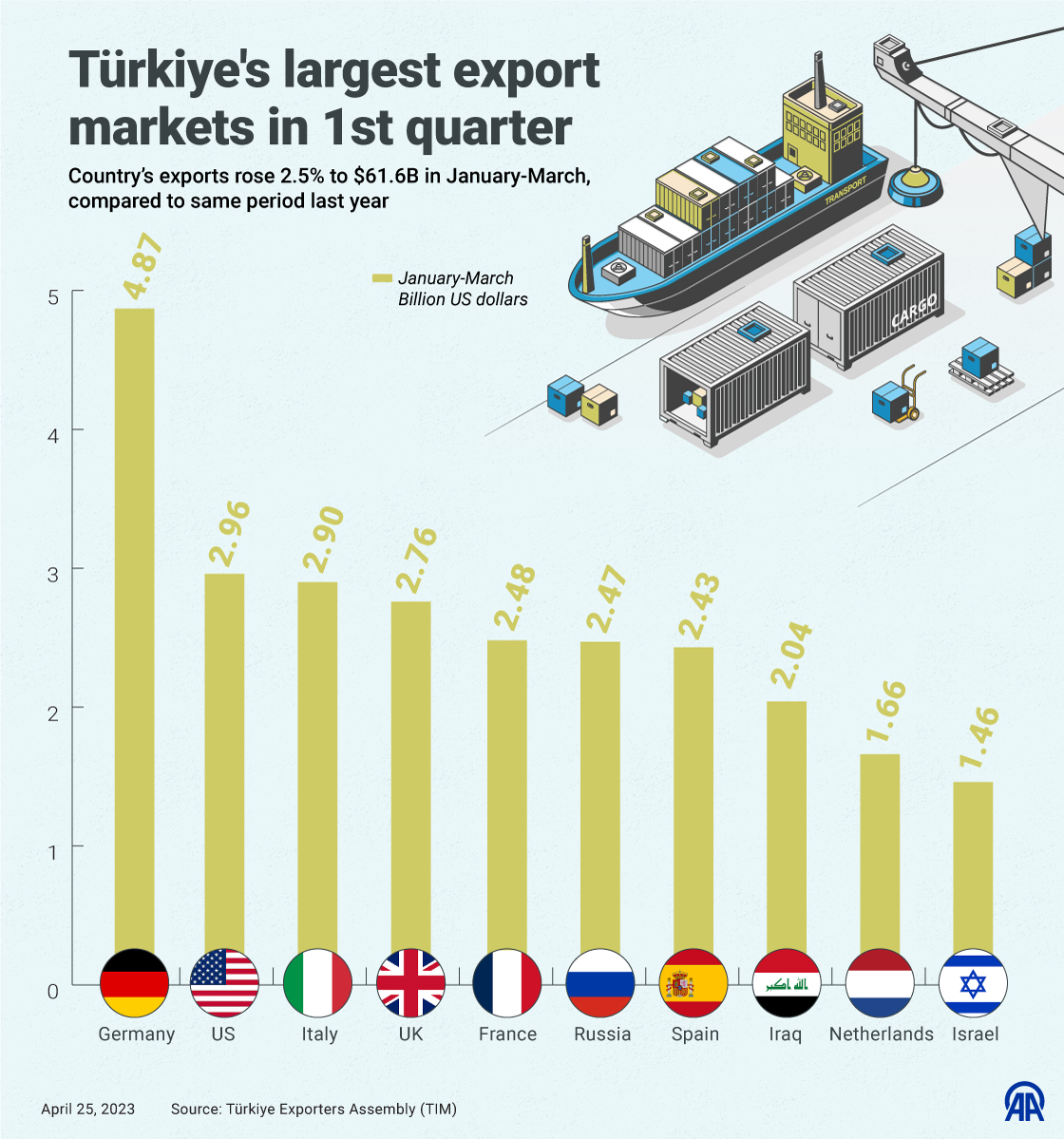 Country’s exports rose 2.5% to $61.6B in January-March, compared to same period last month