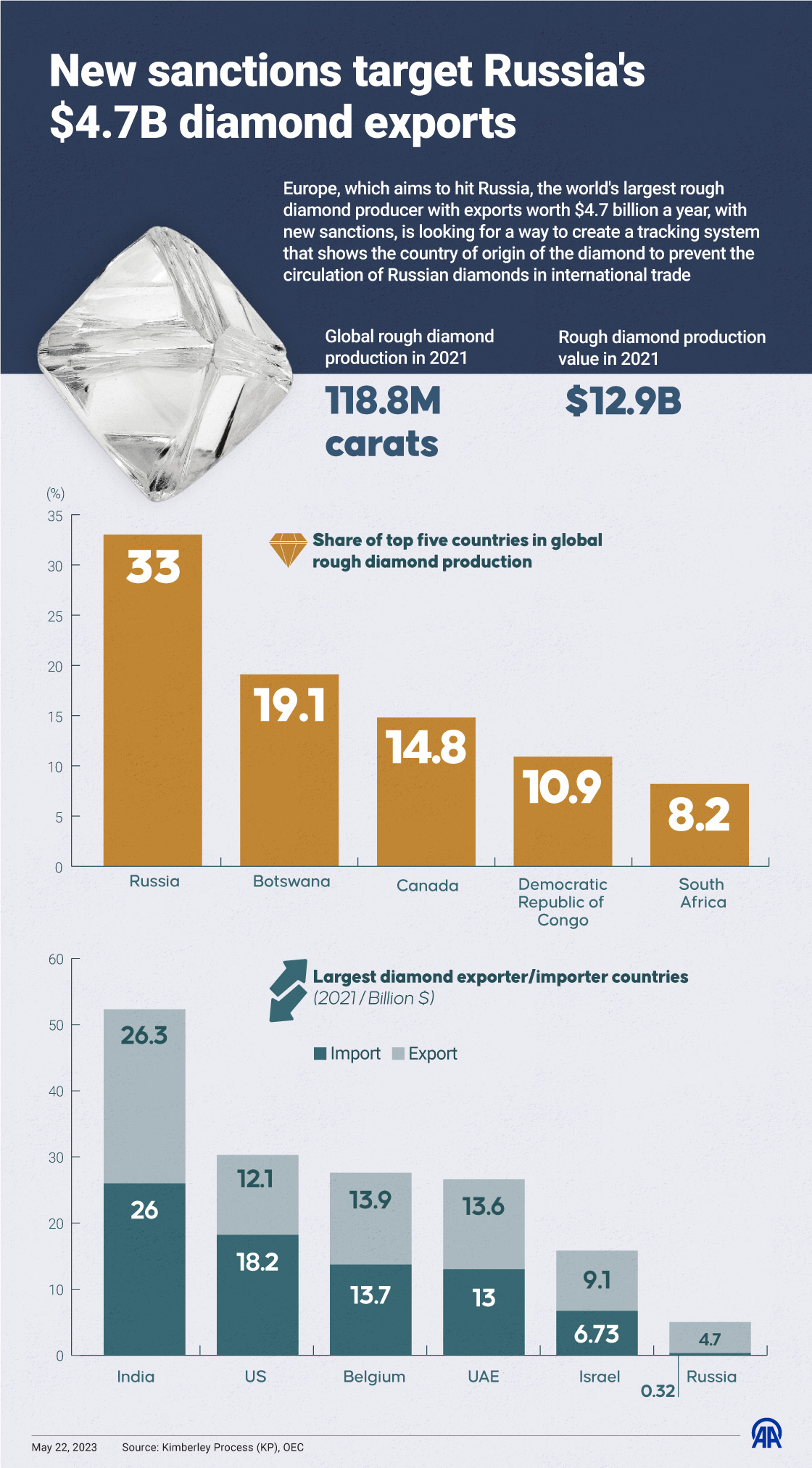Europe, which aims to hit Russia, the world's largest rough diamond producer with exports worth $4.7 billion a year, with new sanctions, is looking for a way to create a tracking system that shows the country of origin of the diamond to prevent the circulation of Russian diamonds in international trade22 May 2023•Update: 22 May 2023