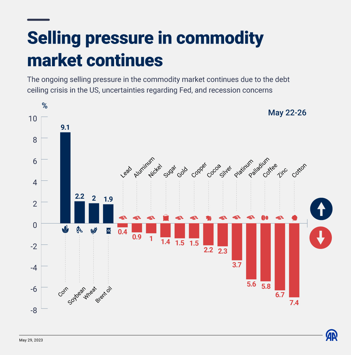 The ongoing selling pressure in the commodity market continues due to the debt ceiling crisis in the US, uncertainties regarding Fed, and recession concerns