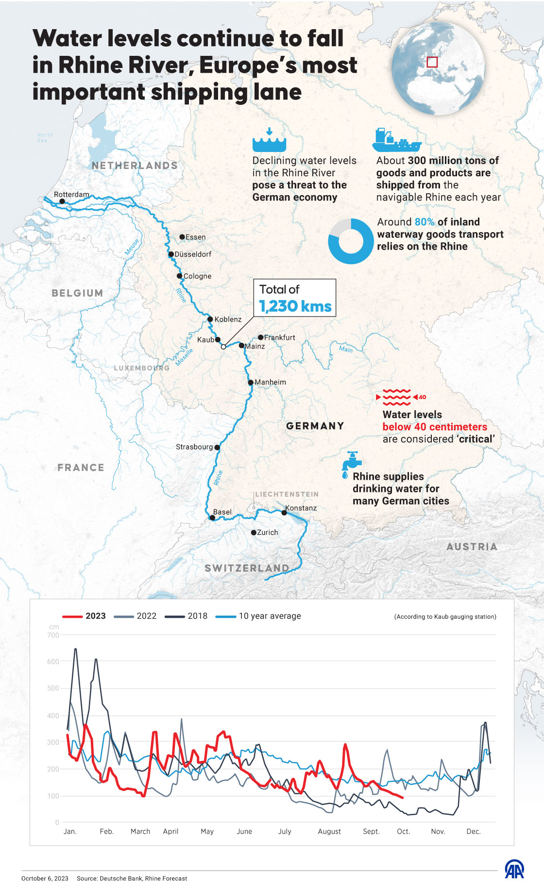 Water levels continue to fall in Rhine River, Europe’s most important shipping lane