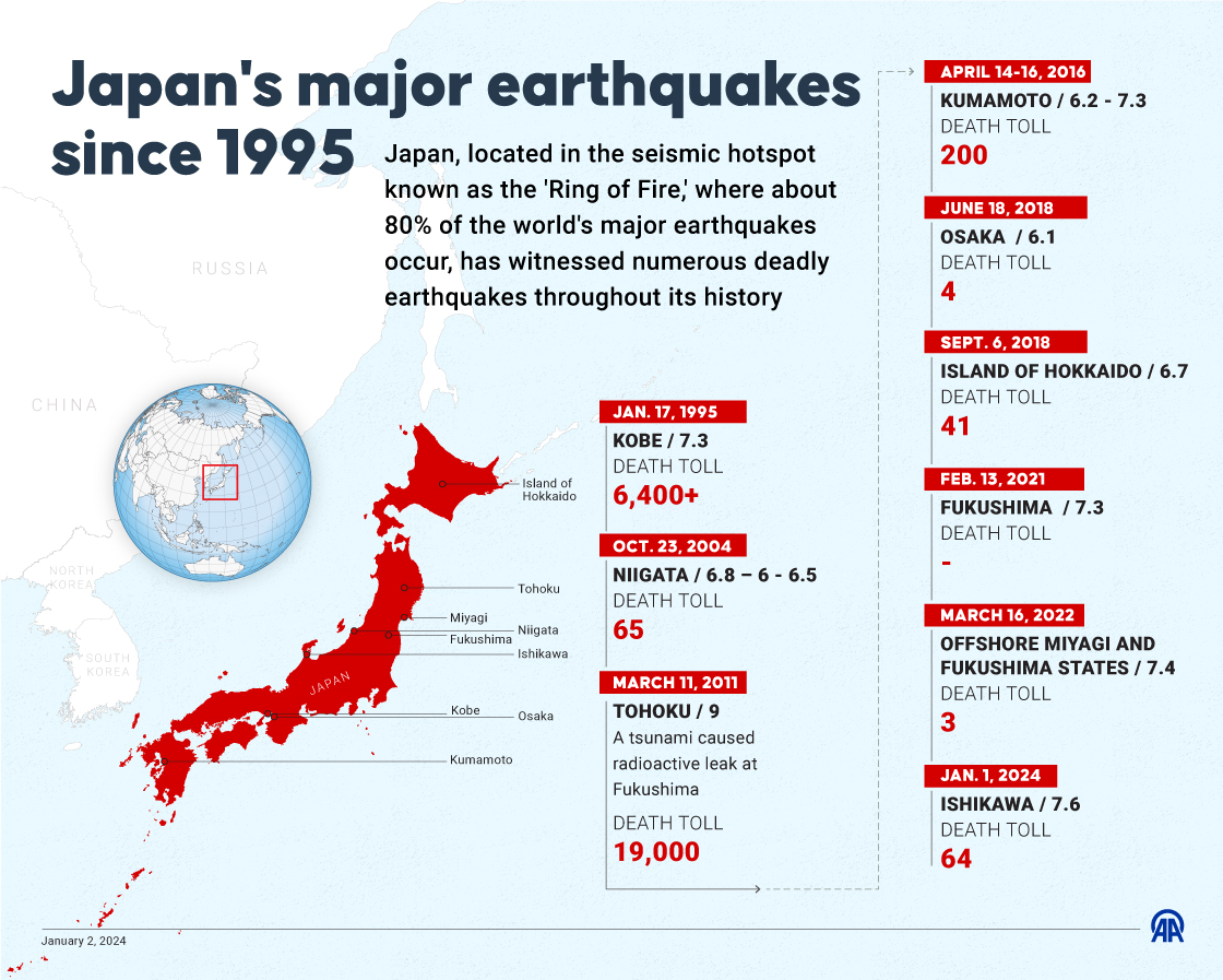 Japan, located in the seismic hotspot known as the 'Ring of Fire,' where about 80% of the world's major earthquakes occur, has witnessed numerous deadly earthquakes throughout its history03 January 2024•Update: 03 January 2024
