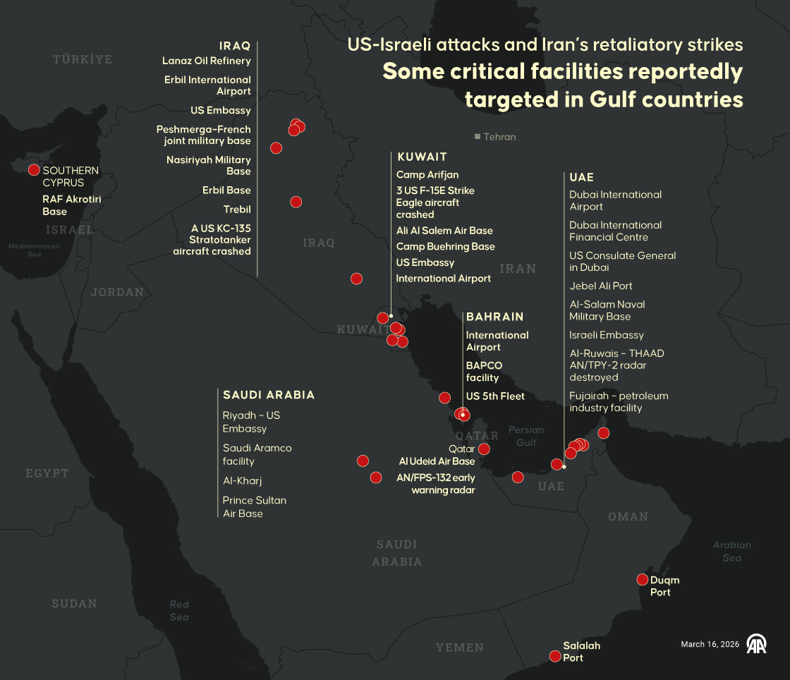 Key sites in Iraq, Kuwait, Bahrain, Qatar, UAE and Saudi Arabia are reported among locations affected16 March 2026•Update: 16 March 2026
