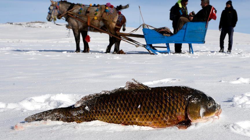 An Eskimo-style fisherman in northeastern Turkey has caught the biggest fish of the winter season -- a freshwater carp of 5.2 kilograms (nearly 11.5 pounds).