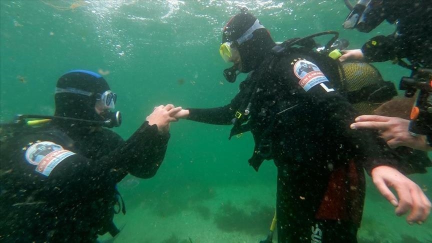 A Turkish couple took their first step to marriage under the deep blue sea.
