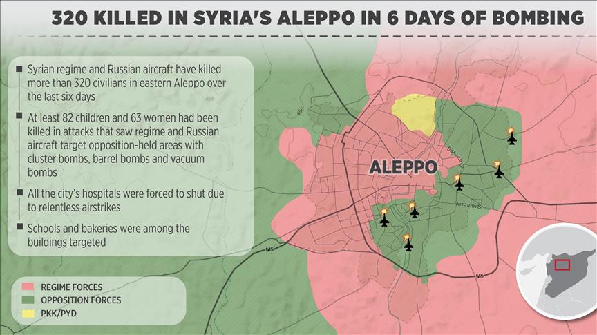 The Syrian regime and Russian aircraft have killed more than 320 civilians in eastern Aleppo over the last six days, a civil defense official said Monday.
