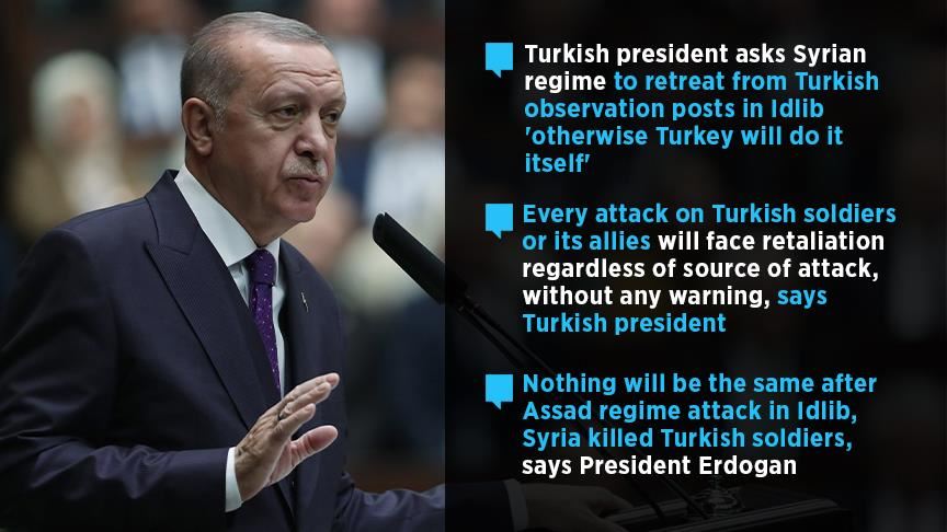"If the Syrian regime will not retreat from Turkish observation posts in Idlib in February, Turkey itself will be obliged to make this happen," Recep Tayyip Erdogan told his party's lawmakers in parliament.