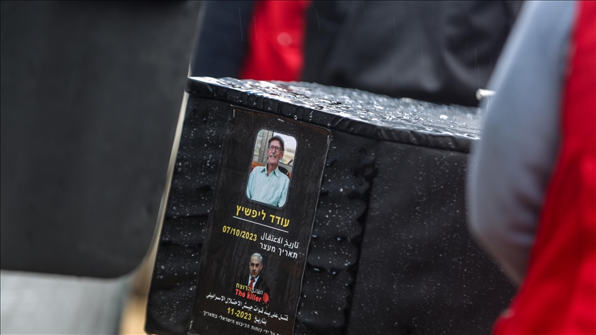 Ahead of the handover, Hamas placed four black caskets on a stage in Khan Younis, behind which a banner was displayed depicting Netanyahu as Dracula, the infamous vampire, positioned above images of the Bibas family and Lifshitz.
